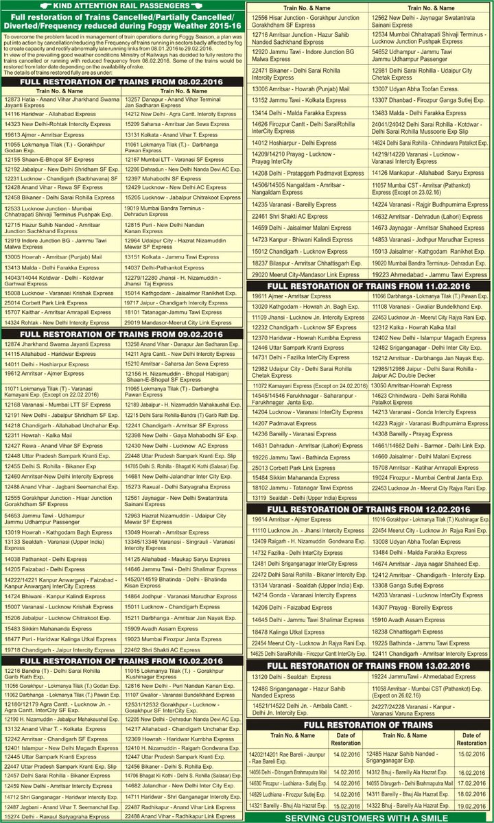 FULLY RESTORATION OF TRAINS THOSE WERE EARLIER CANCELLED/RUNNING WITH REDUCED FREQUENCY FROM 08.01.2016 TO 29.2.2016