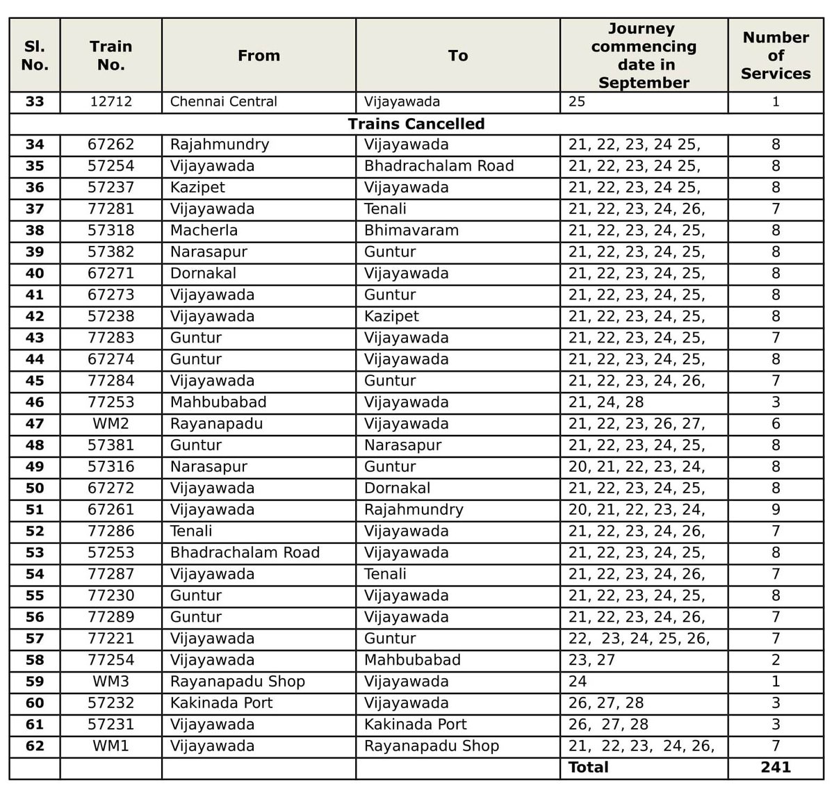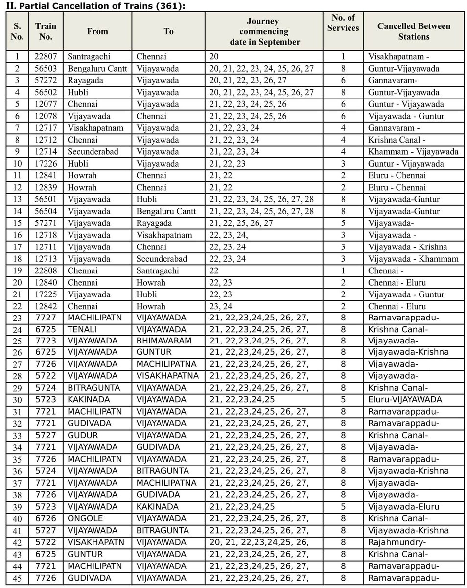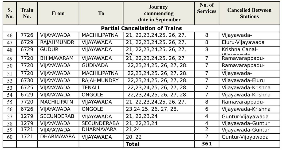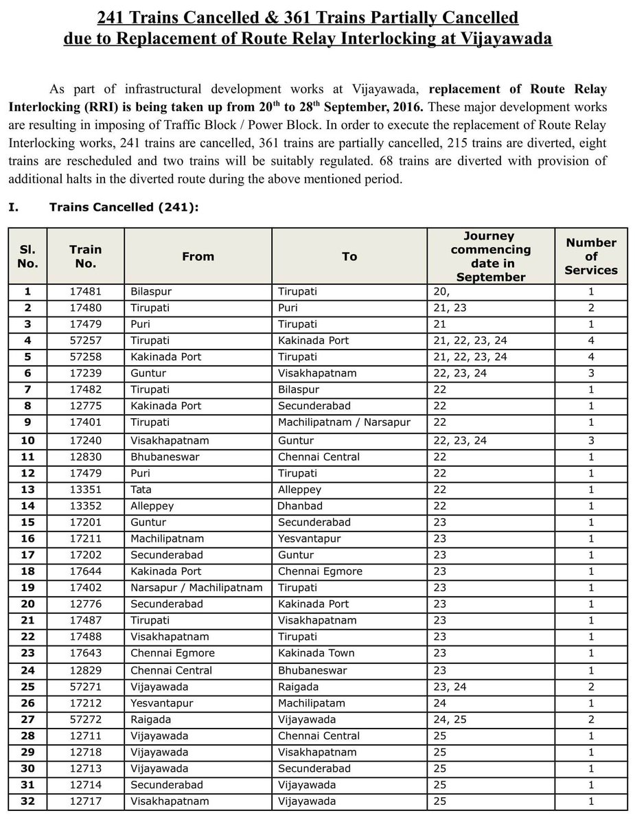 241 Trains Cancelled & 361 Trains Partially Cancelled due to RRI work at Vijayawada.