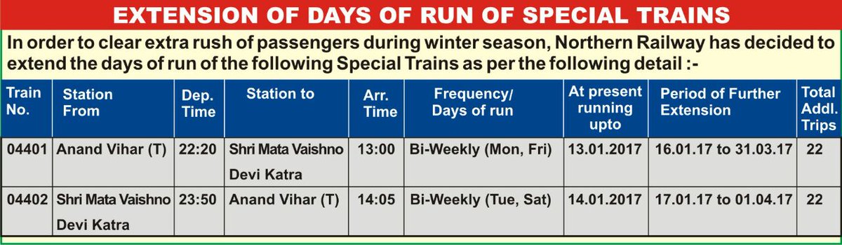 Days of run of Anand Vihar-Shri Mata Vaishno Devi Katra Spl train extended.